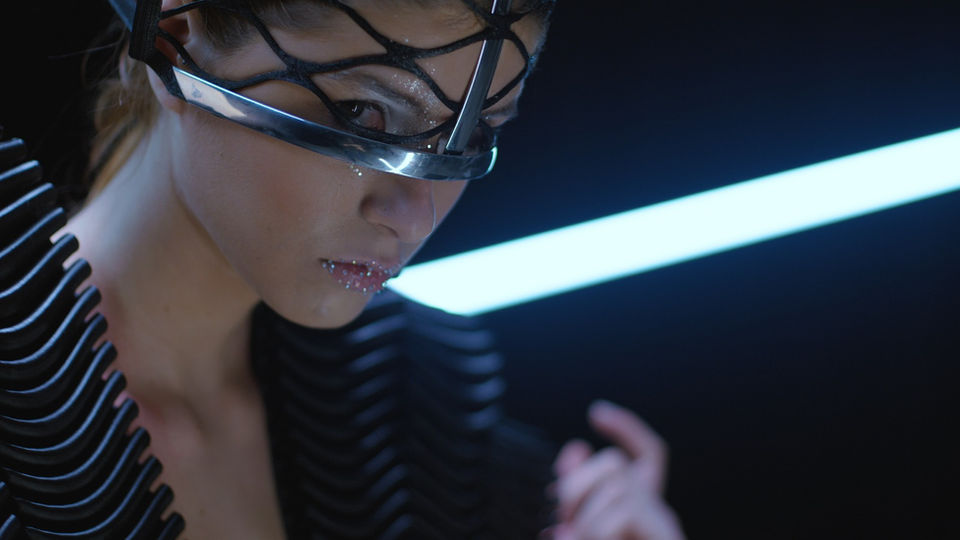Fasci di luce silver racchiudono in sé una creatura elegante, algida ed essenziale.